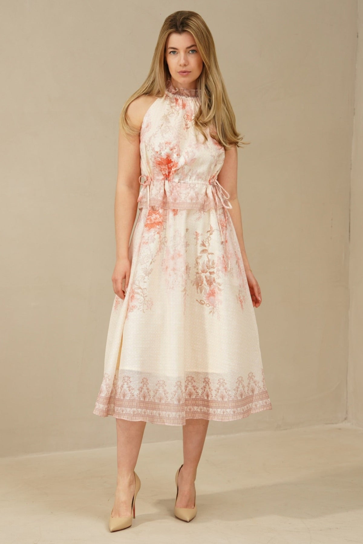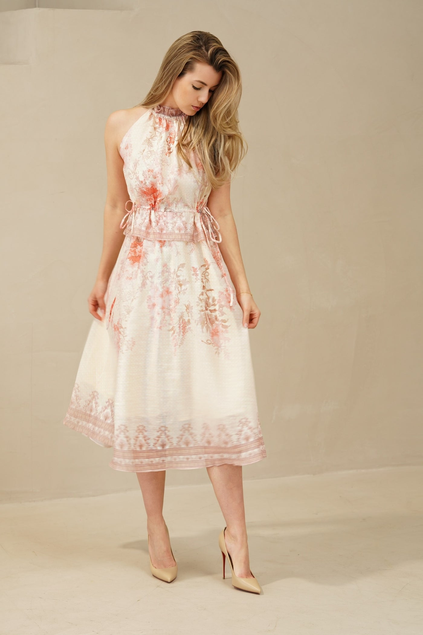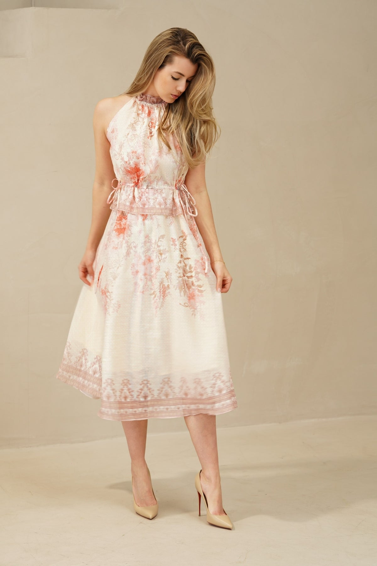 SAKURÀ combines classic elegance with delicate romance. With its floral print in shades of rose and beige, flowing midi cut, and delicate tie details, this dress is the ideal choice for weddings, summer parties, or stylish daytime looks.
